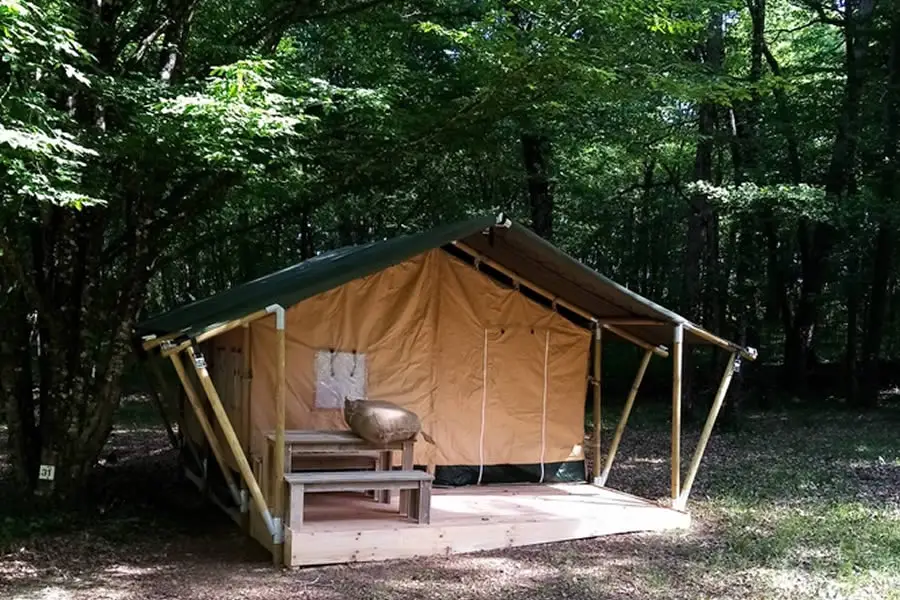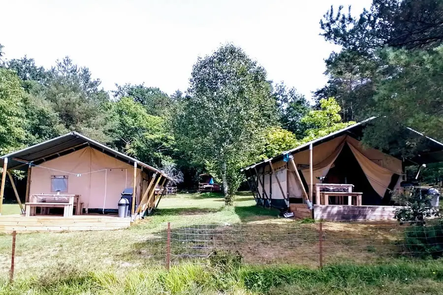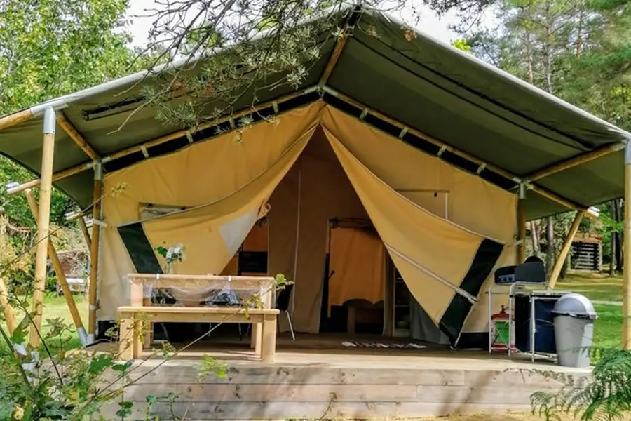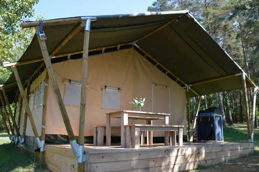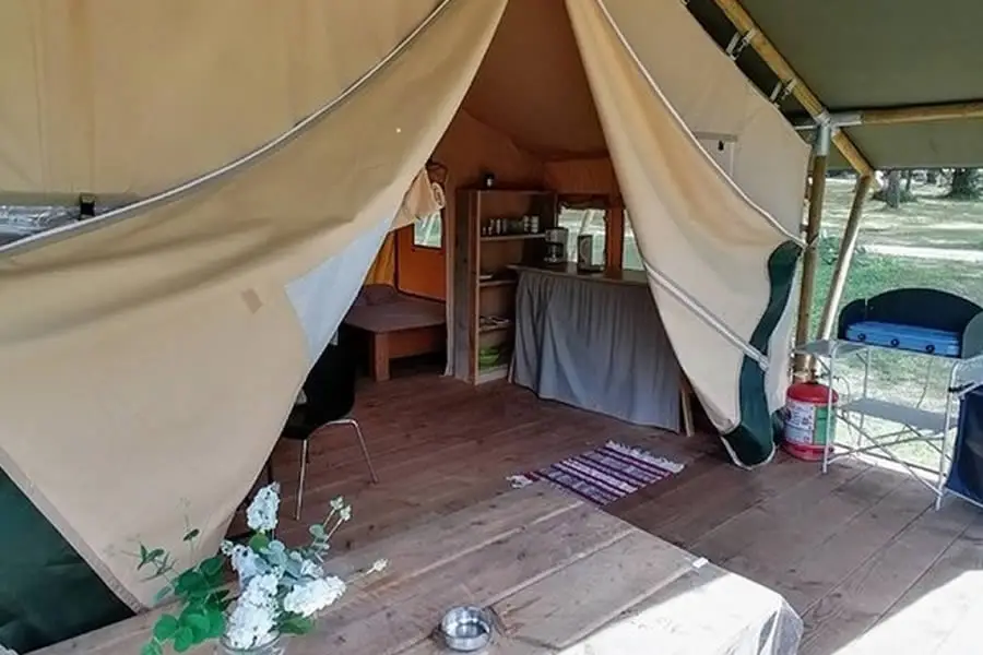 Tente safari de luxe avec terrasse et mobilier de jardin. Comprend une cuisine complète avec une cuisinière à gaz à 3 feux, un placard et un réfrigérateur. Le séjour comprend une table, un canapé et 2 chaises. La tente dispose de 2 chambres. Deux tentes (5 et 6 personnes) offrent une vue magnifique sur les champs et une tente (5 personnes) est installée sous les pins, soleil/ombre.