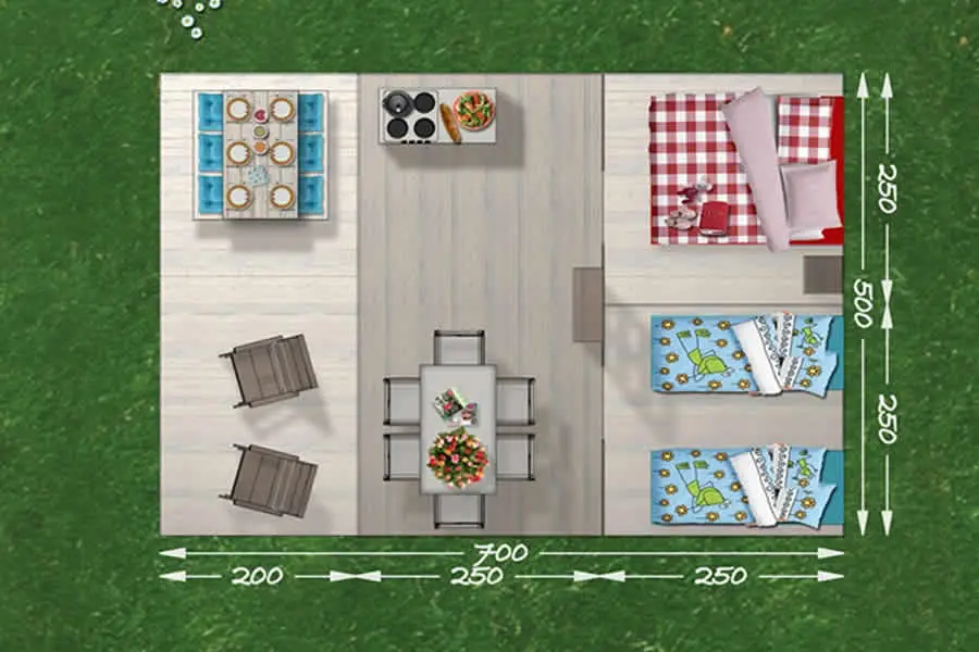La cuisine comprend: 1 cuisinière à gaz 3 brûleurs, 1 étagère rangement vaisselle, 1 réfrigérateur. Le séjour: une petite table et 2 chaises, un canapé .La tente dispose de 2 chambres.